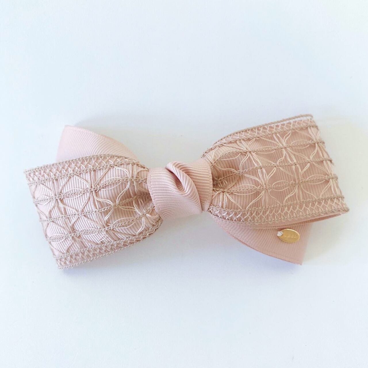 透け感のあるレースのリボンをステンドグラスのように仕立てました。シンプルなデザインでオフィスコーデや学校行事など、日常でもお使いいただきやすいデザインです。