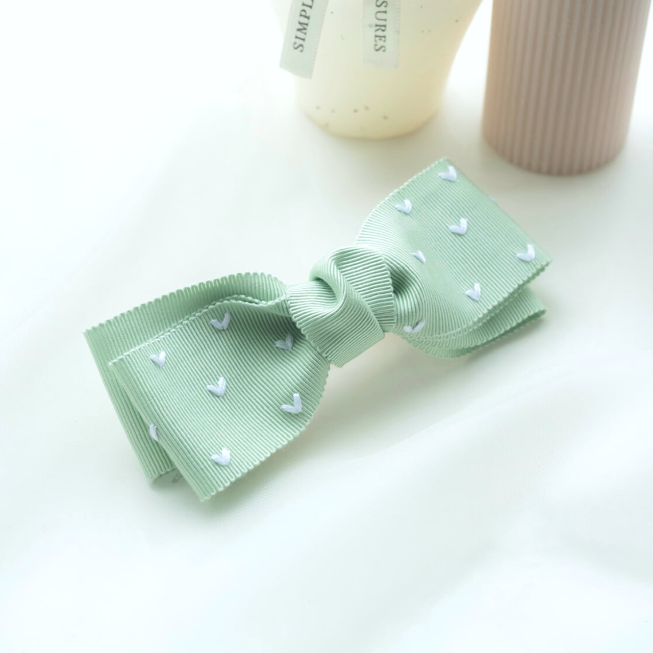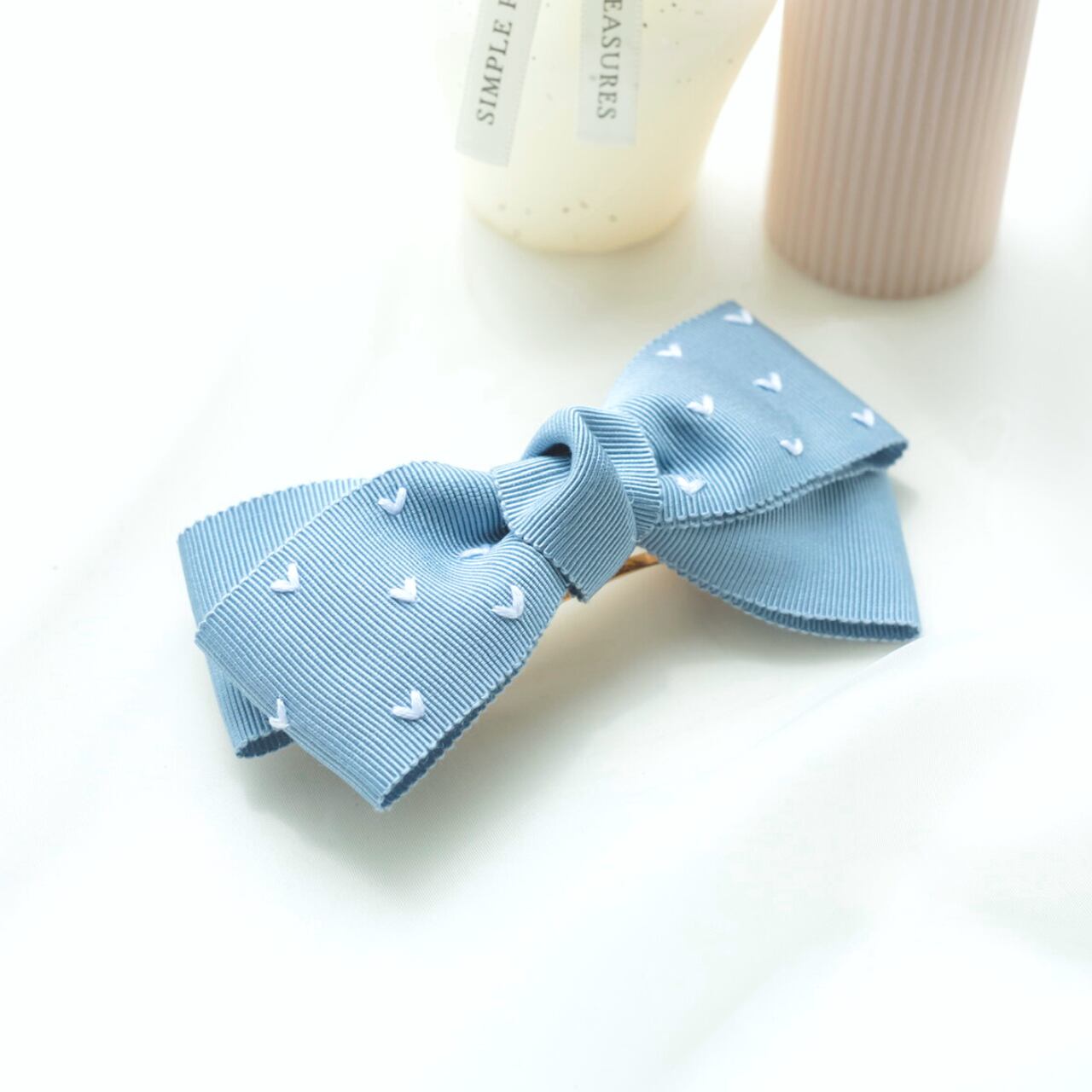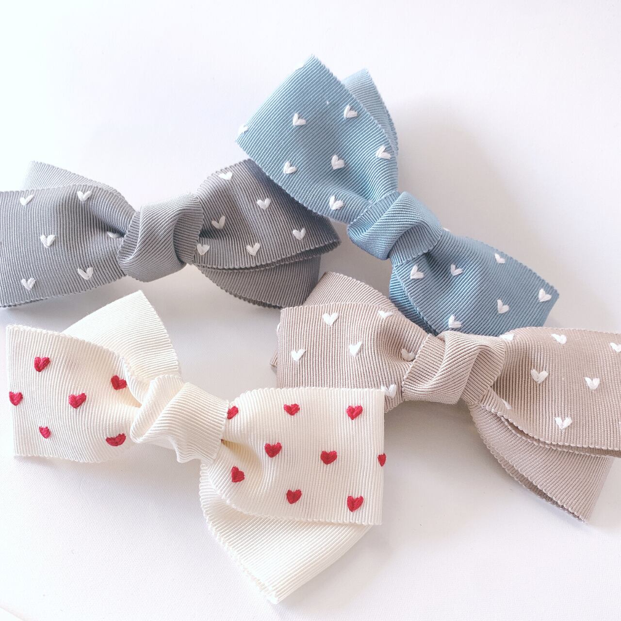 パステルカラーのリボンに白い刺繍糸で小さなハートをたくさん刺しました。