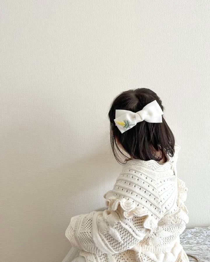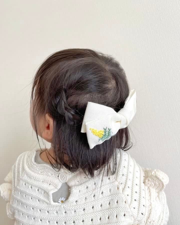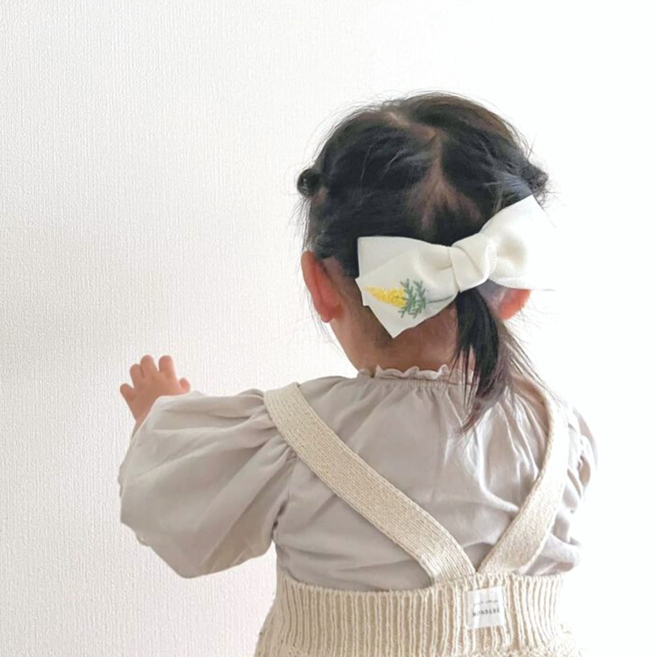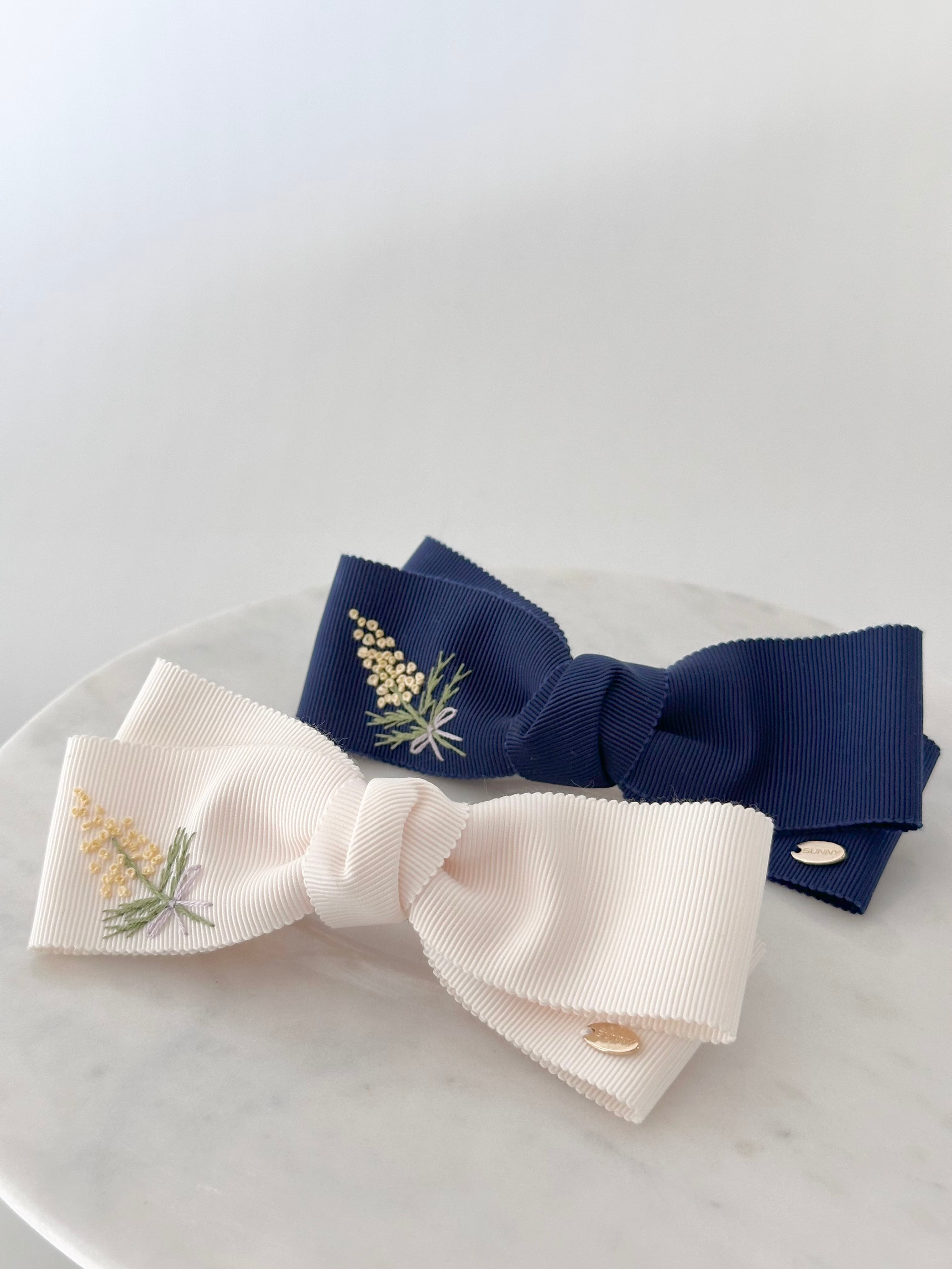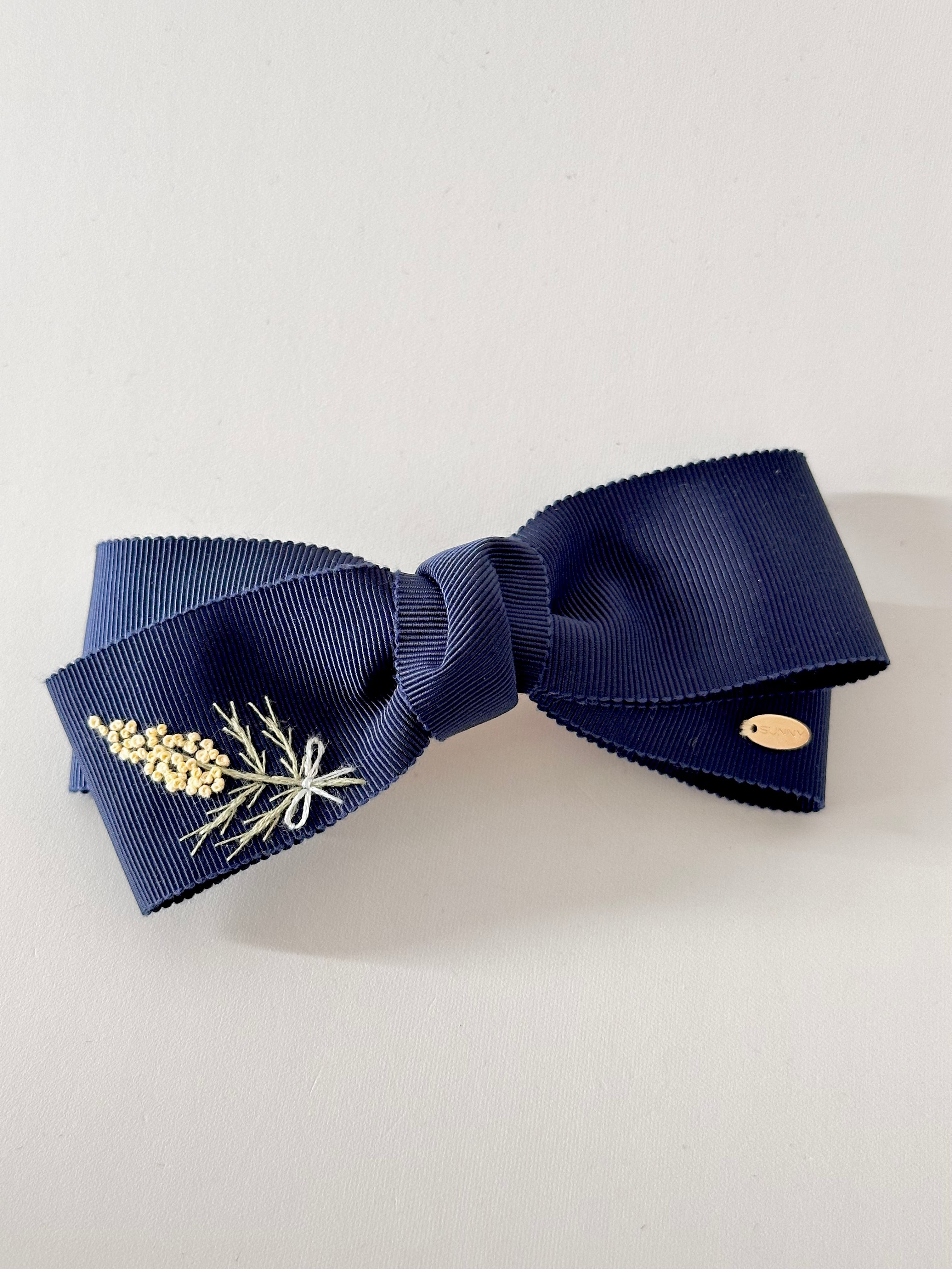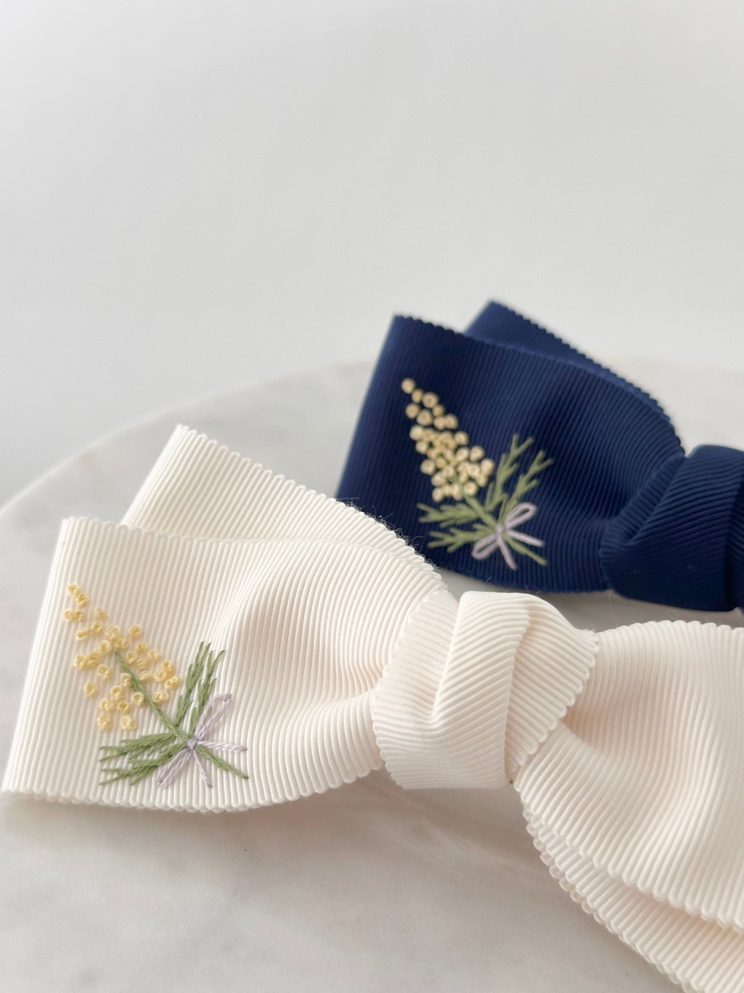 春らしい明るめのオフホワイトリボン、落ち着いたネイビーのリボンにくすみイエローで小さなミモザを刺繍しました。