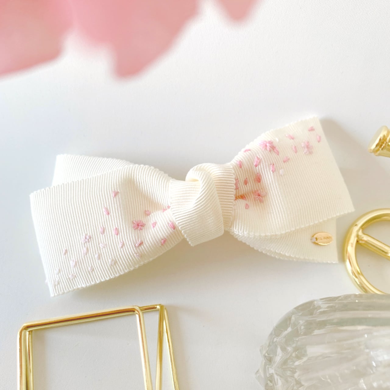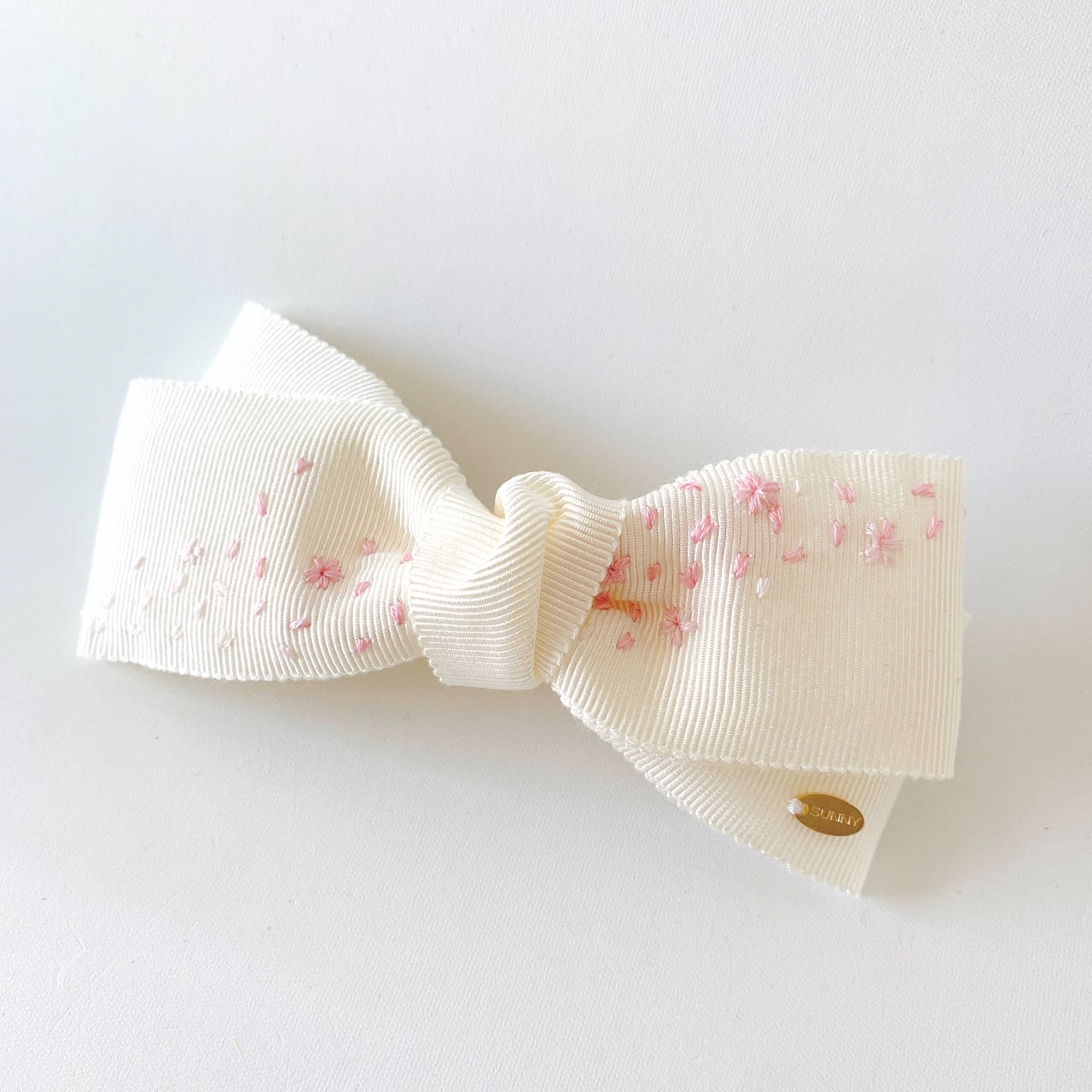 やわらかなオフホワイトのリボンに繊細で儚い桜の花を散りばめました。まるで桜吹雪が舞っているような軽やかな刺繍リボンです。