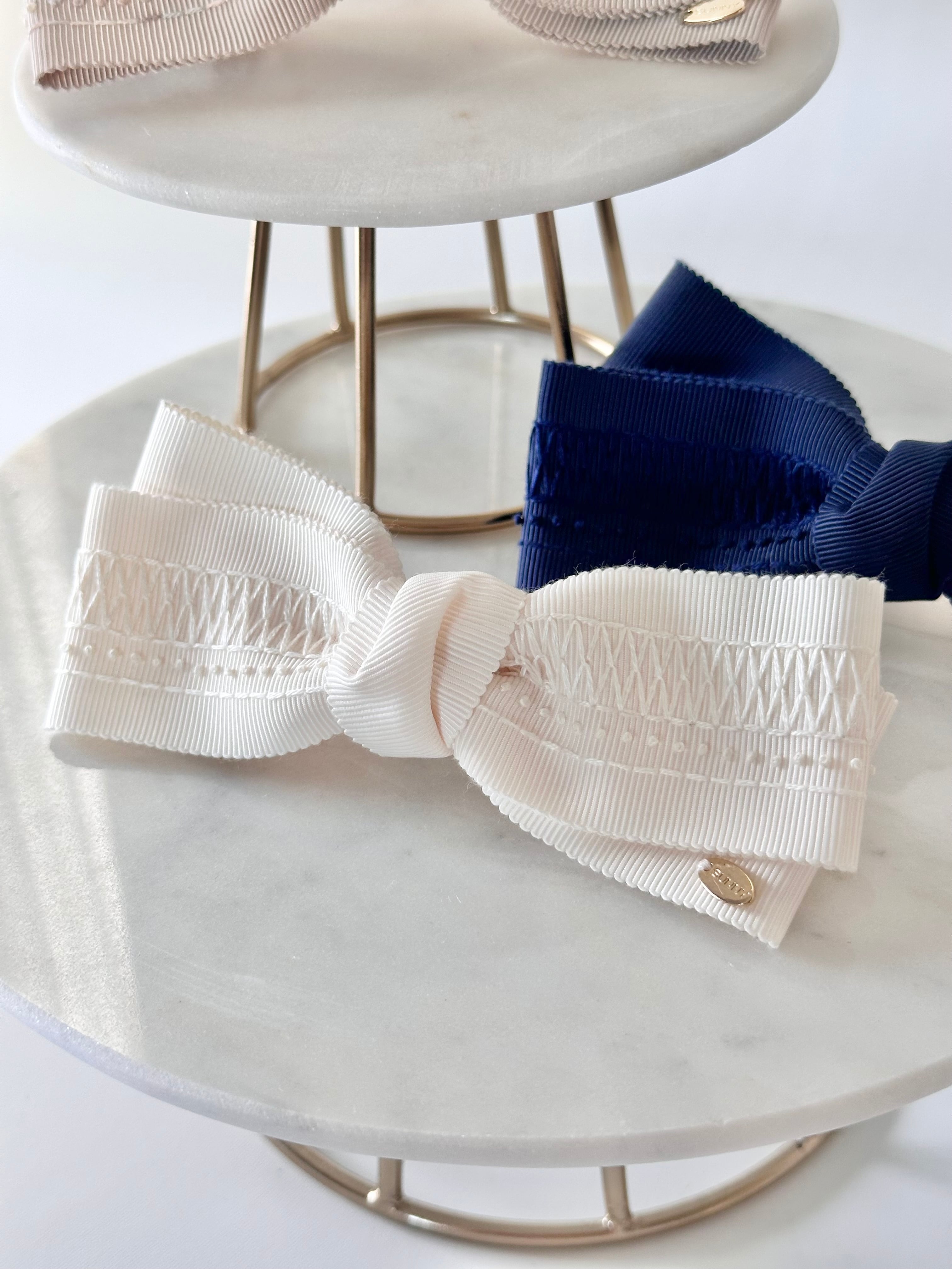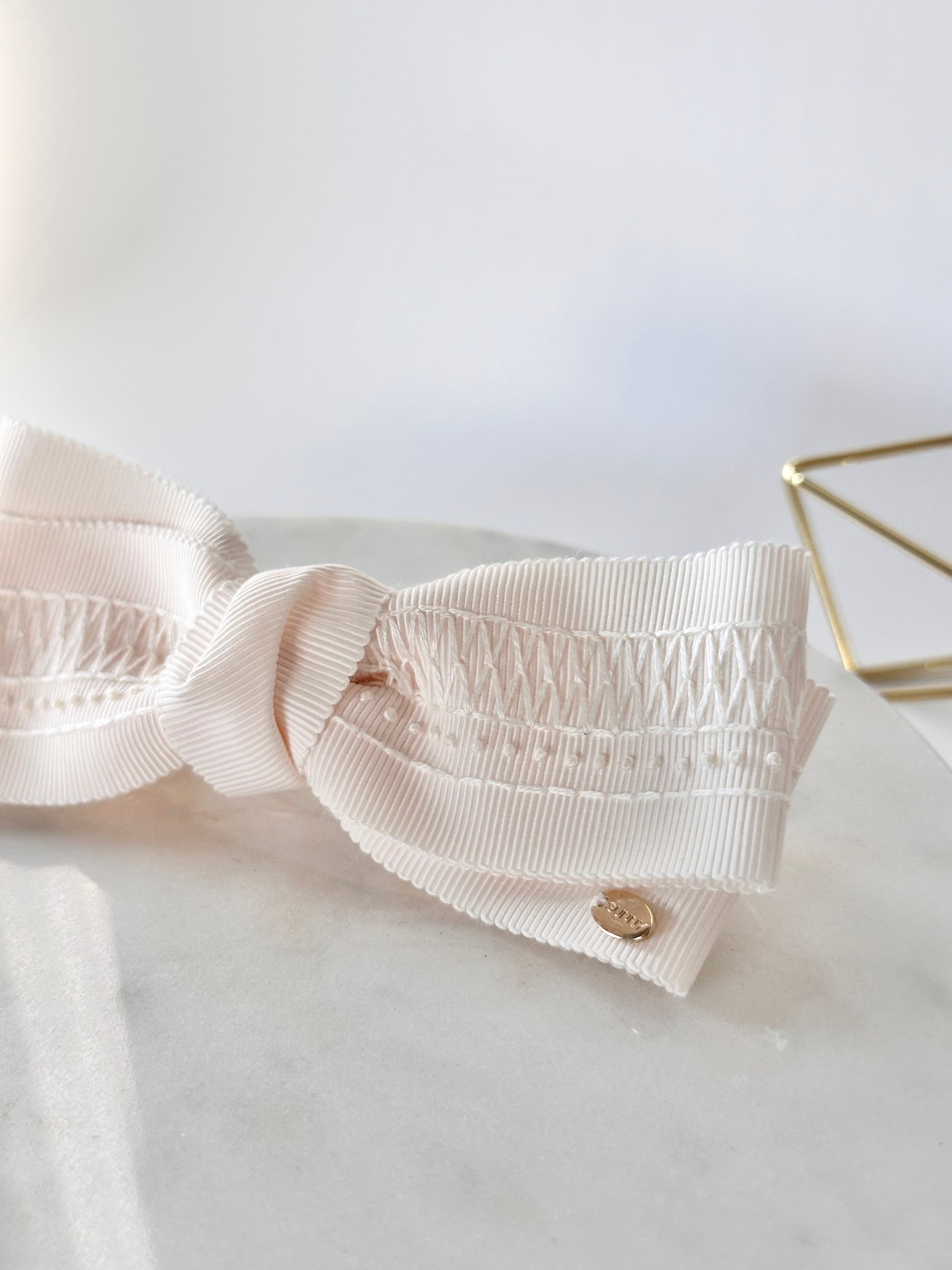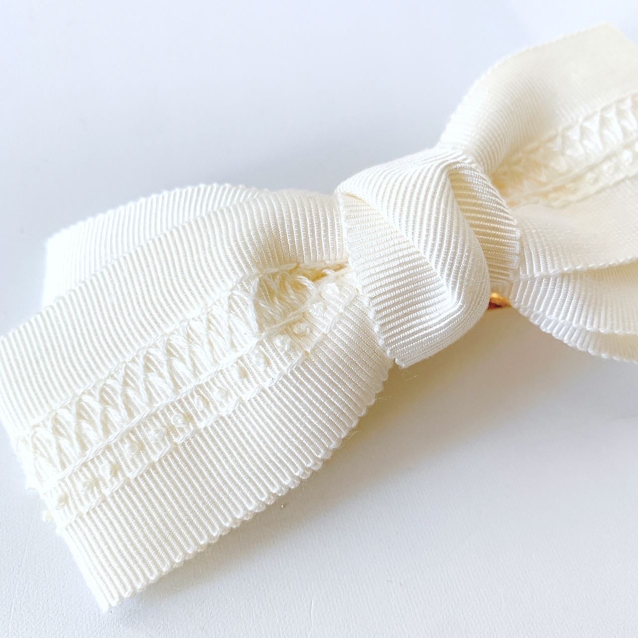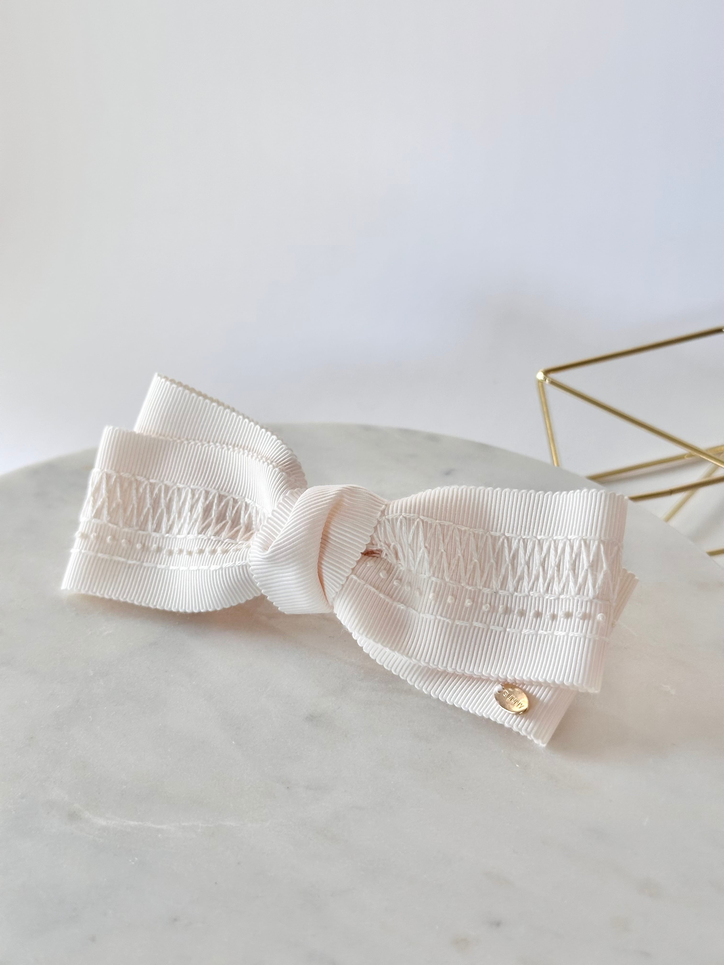 真っ白なリボンに白い糸で刺繍をすると、刺繍糸の陰影でとても綺麗です。リボンの織を活かしたスモッキングみたいな模様を刺繍しました。