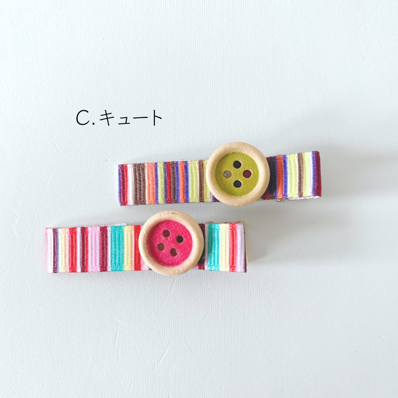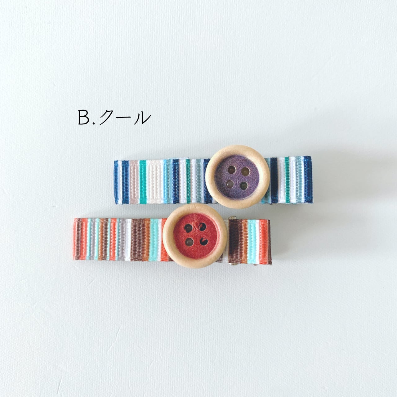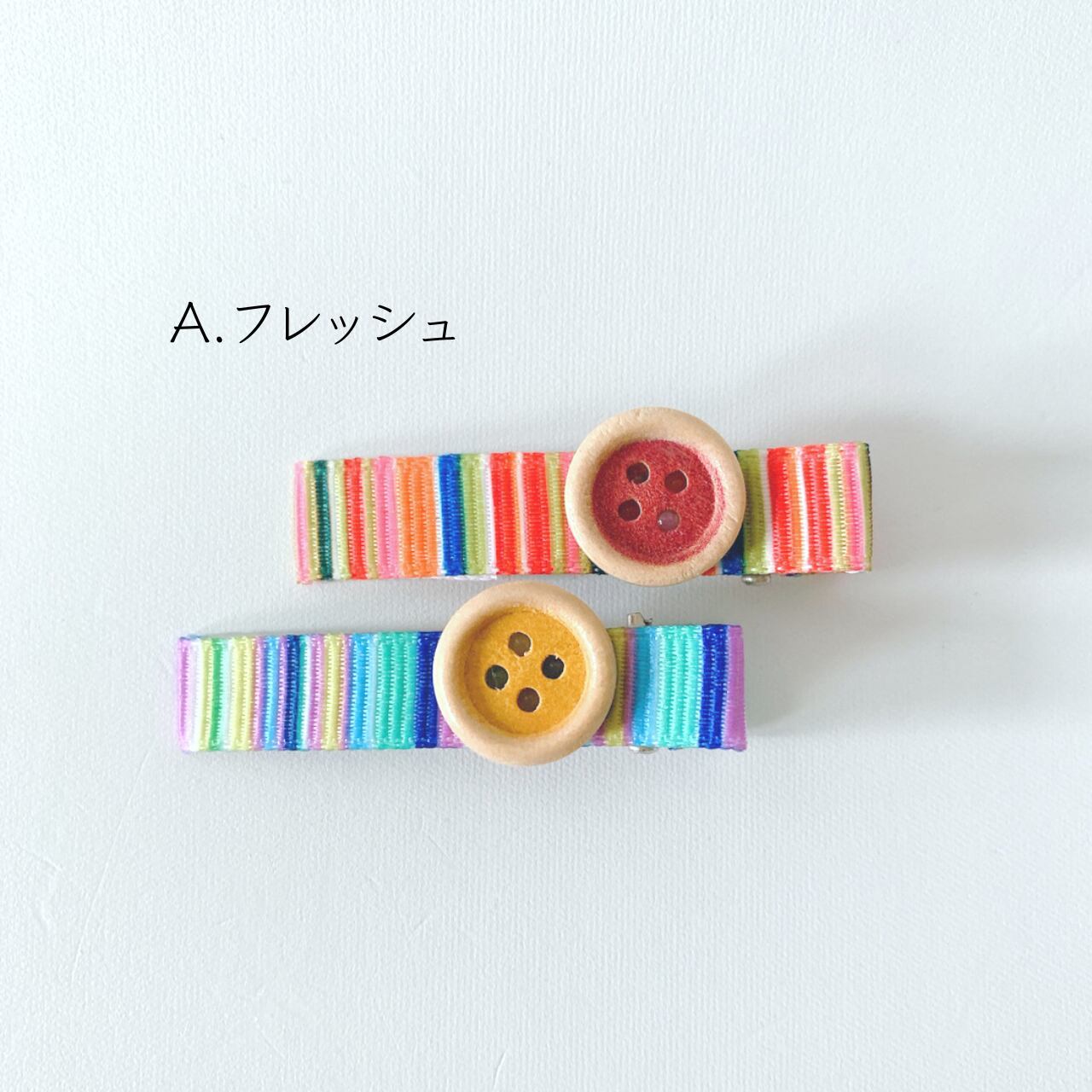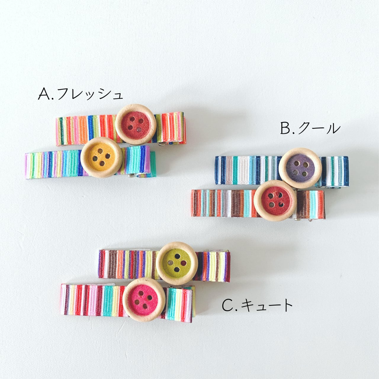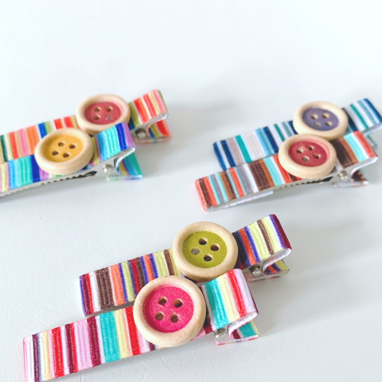 フランスから取寄せたカラフルなストライプリボンに手仕事で色付けされたボタンを合わせました。【2個セット】
