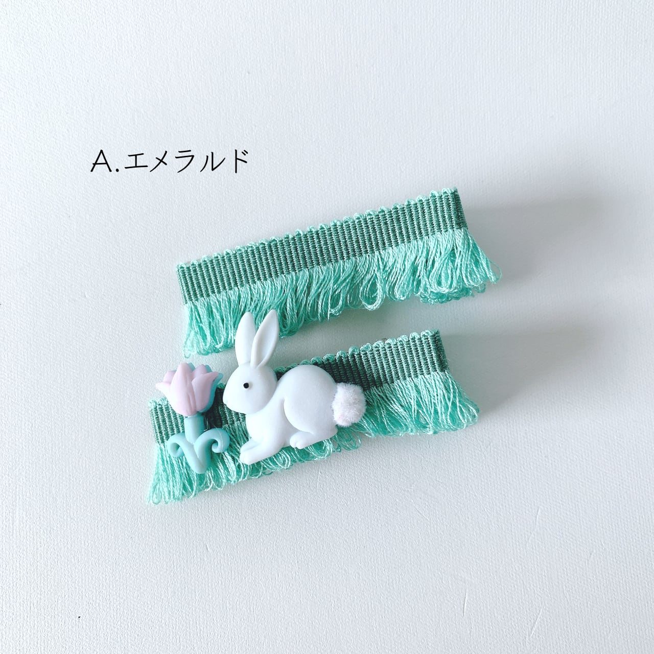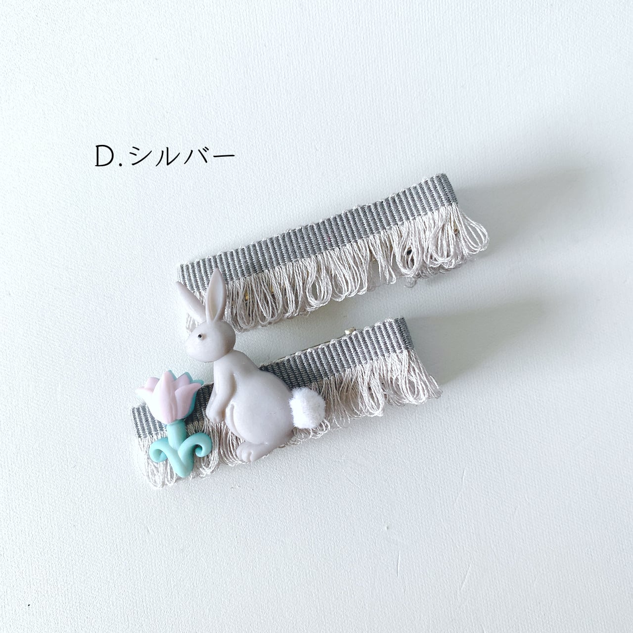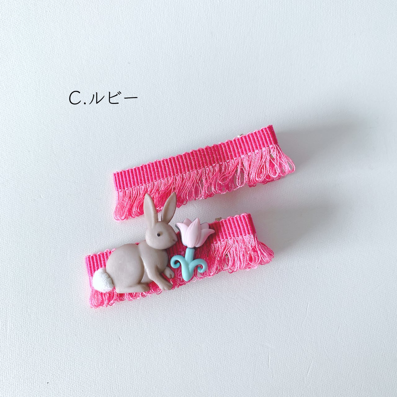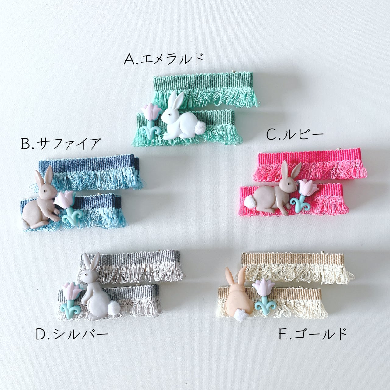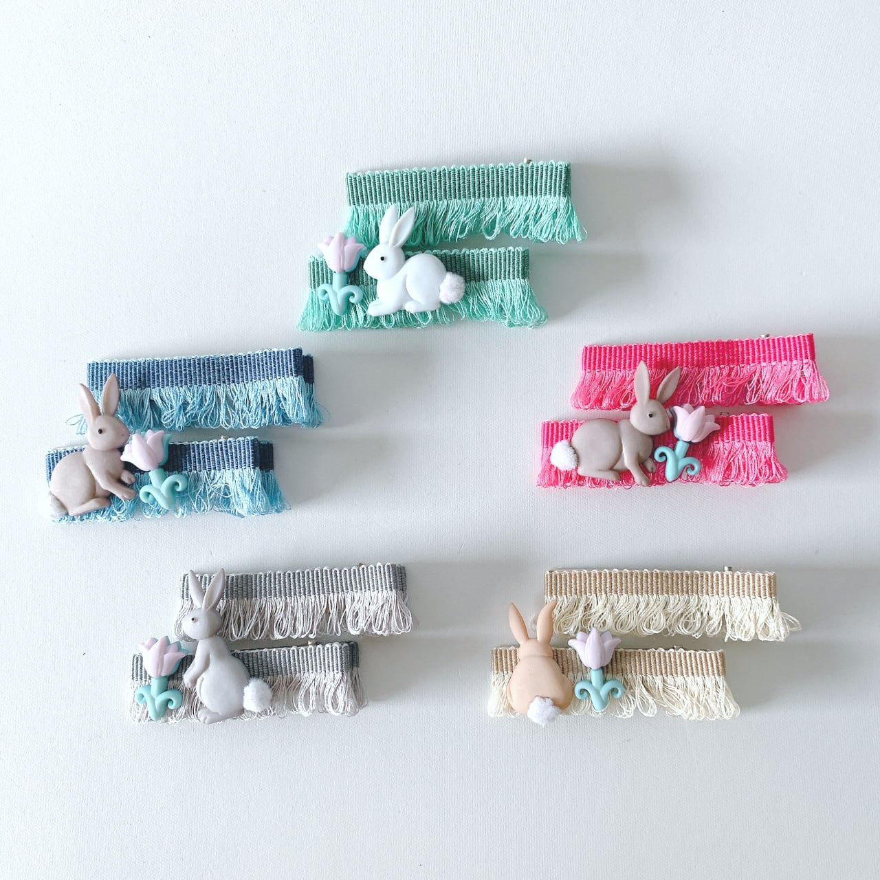 フランスから取寄せたフリンジが素敵な5色のリボンに可愛らしいウサギさんをつけました。