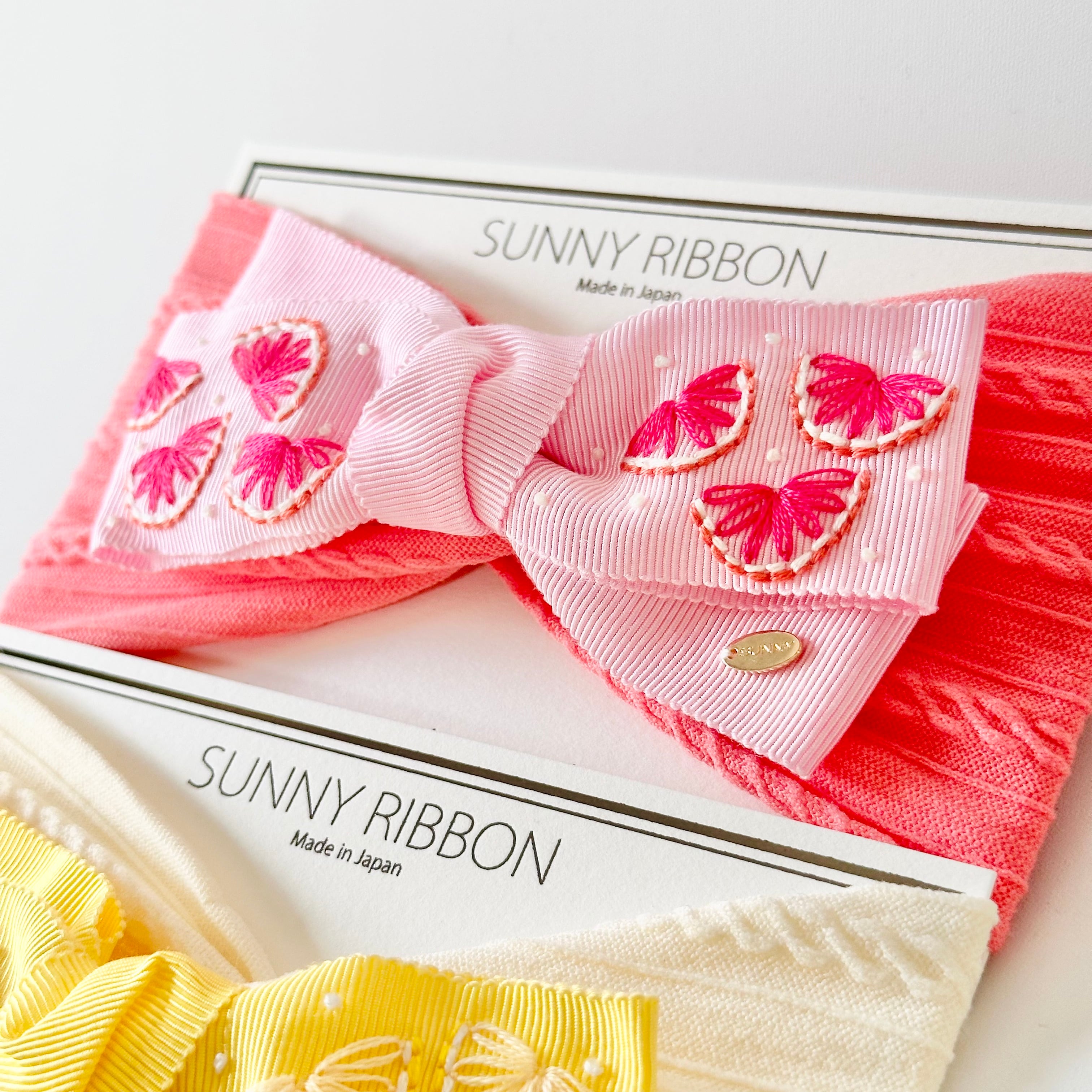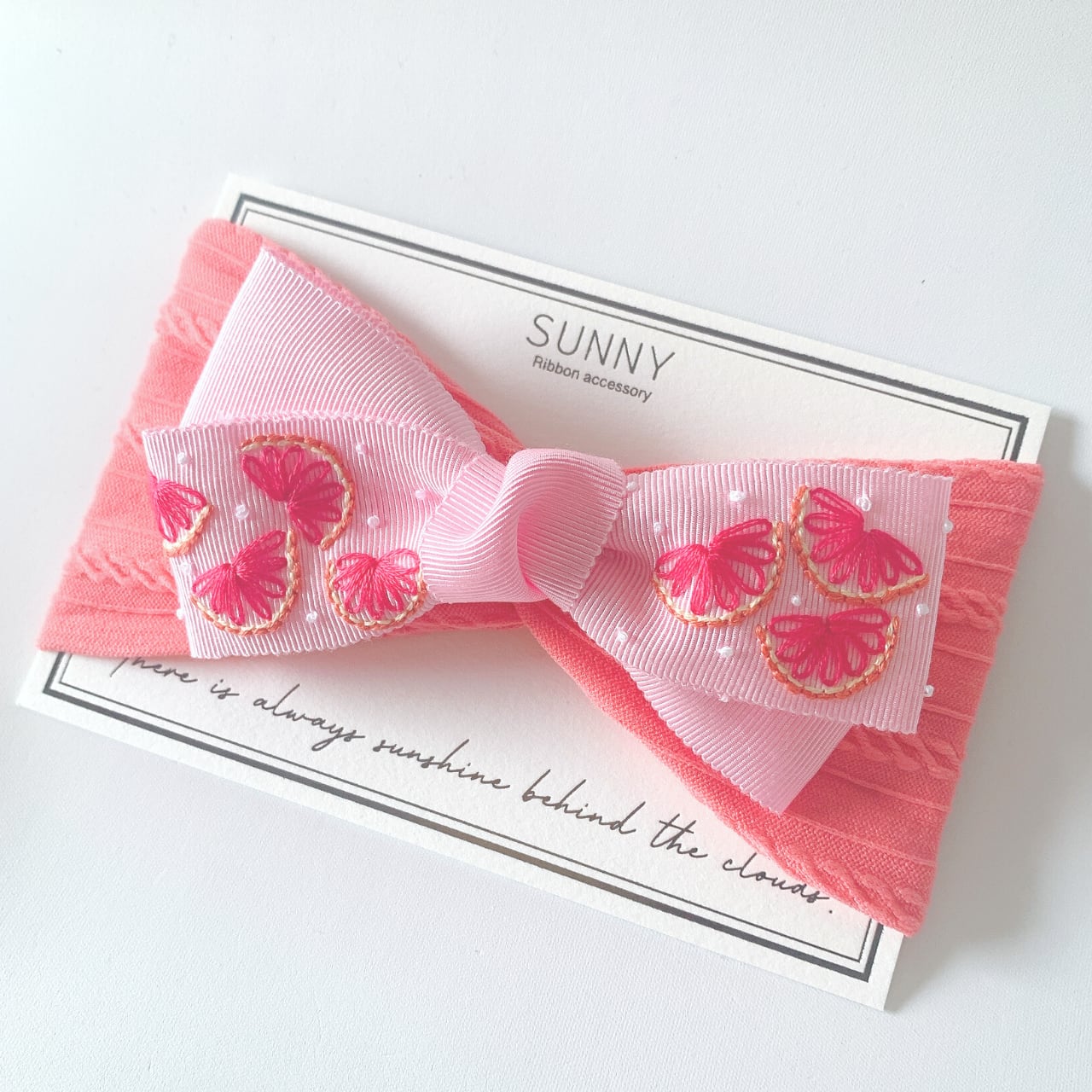 パステルピンクのリボンに瑞々しいグレープフルーツを刺繍しました。明るい色のリボンが可愛い。