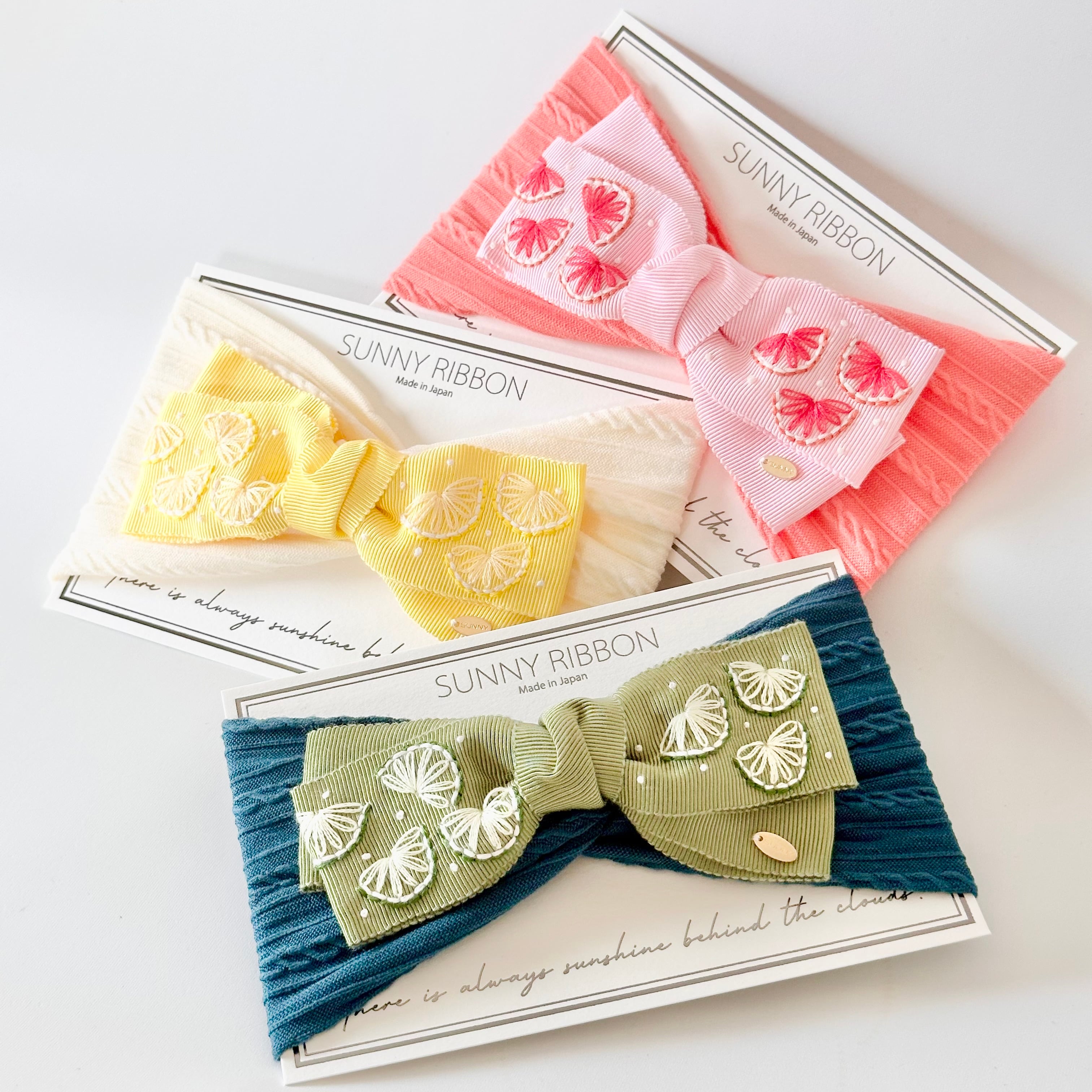 リボンに瑞々しいフルーツを刺繍しました。グレープフルーツとレモンは明るい色のリボンが可愛い。ライムはちょっと大人っぽく。