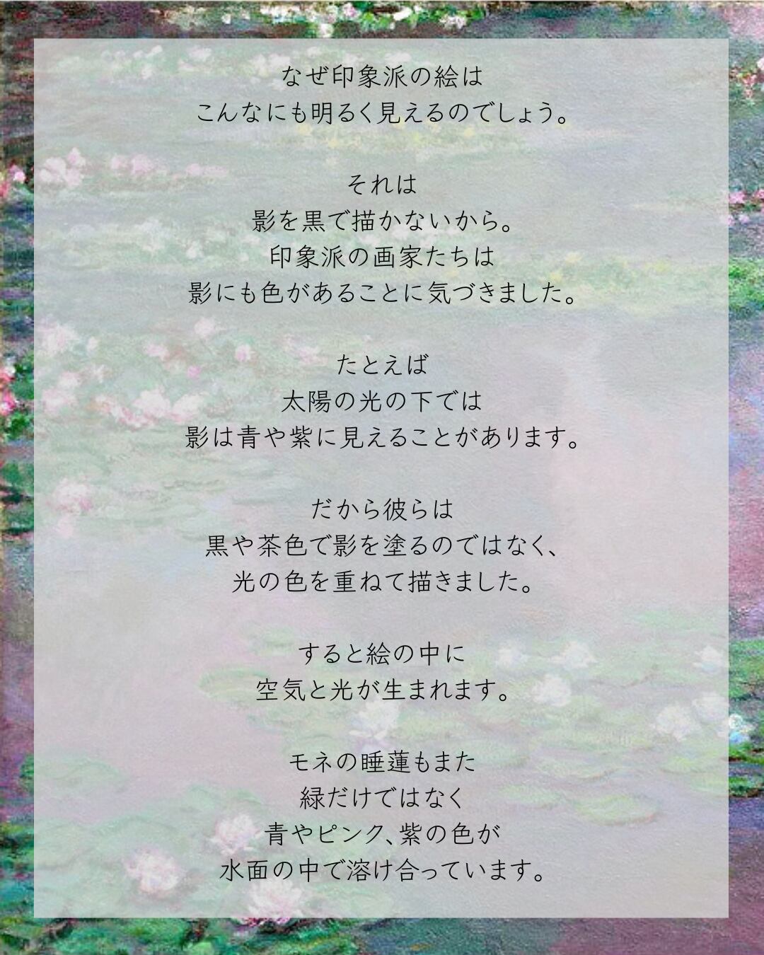 印象派の絵画が明るく美しい色彩に見えるのは、影を黒で描かないから。光にも色があるの気がついたのです。