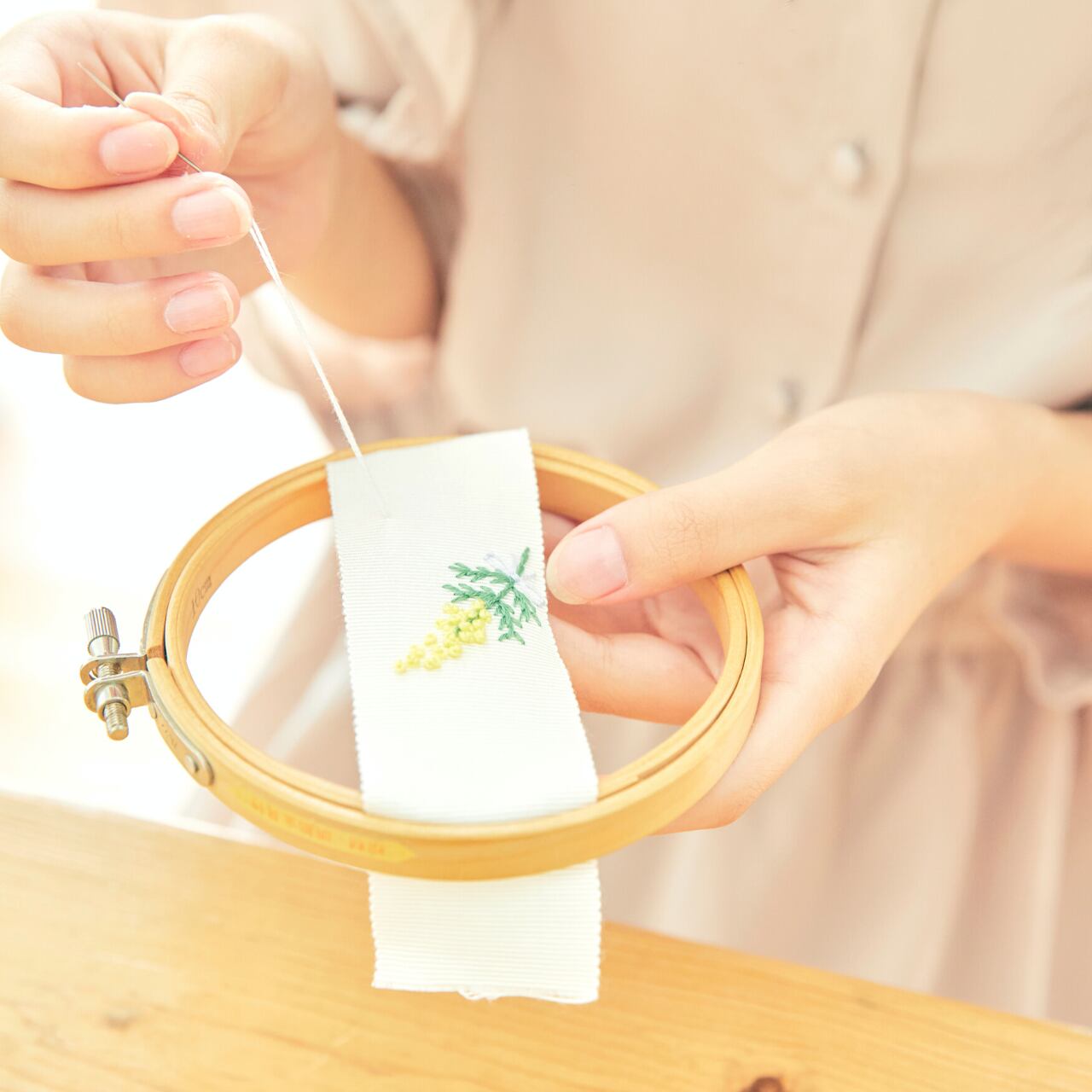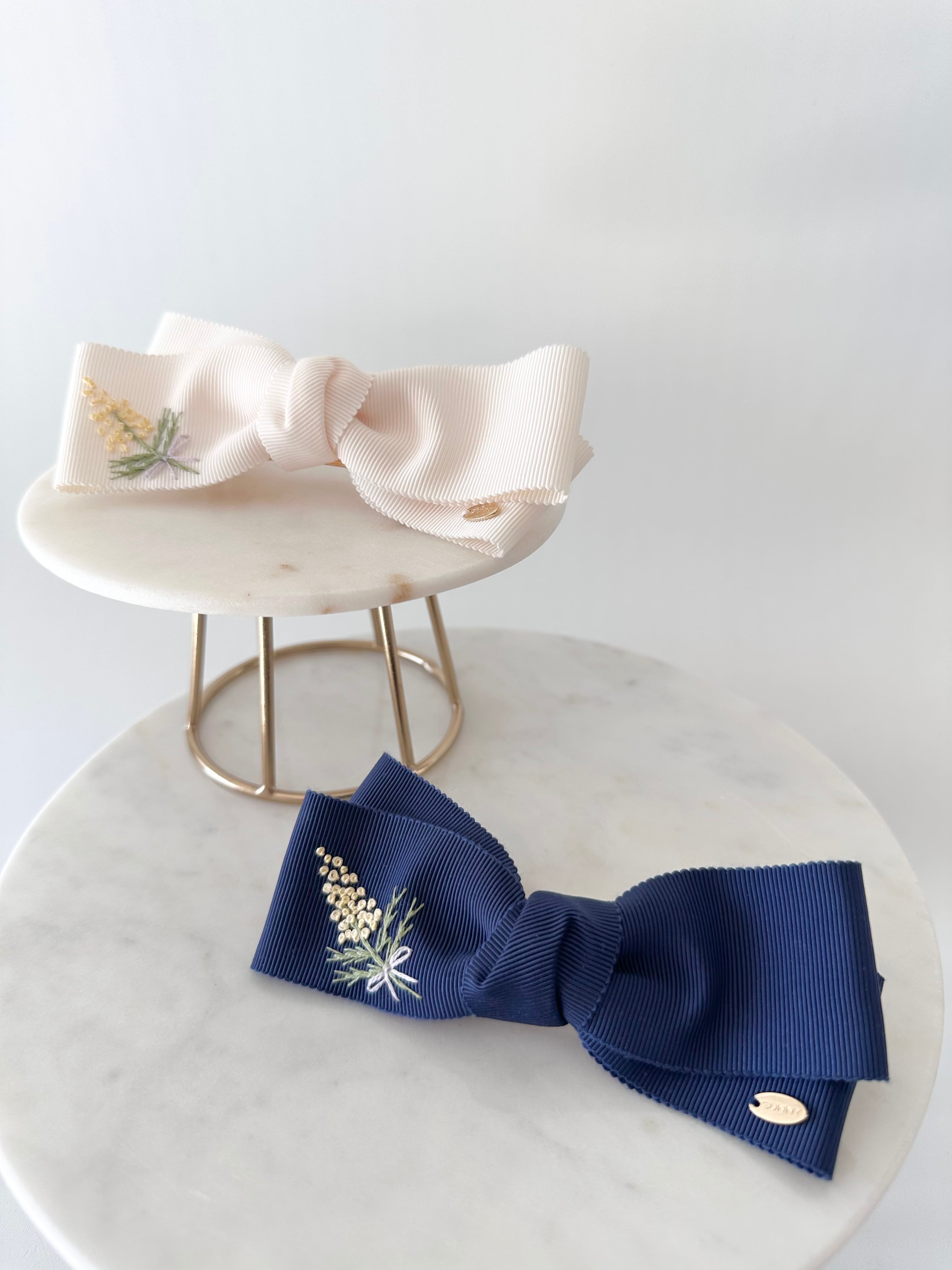 春らしい明るめのオフホワイトリボン、落ち着いたネイビーのリボンにくすみイエローで小さなミモザを刺繍しました。