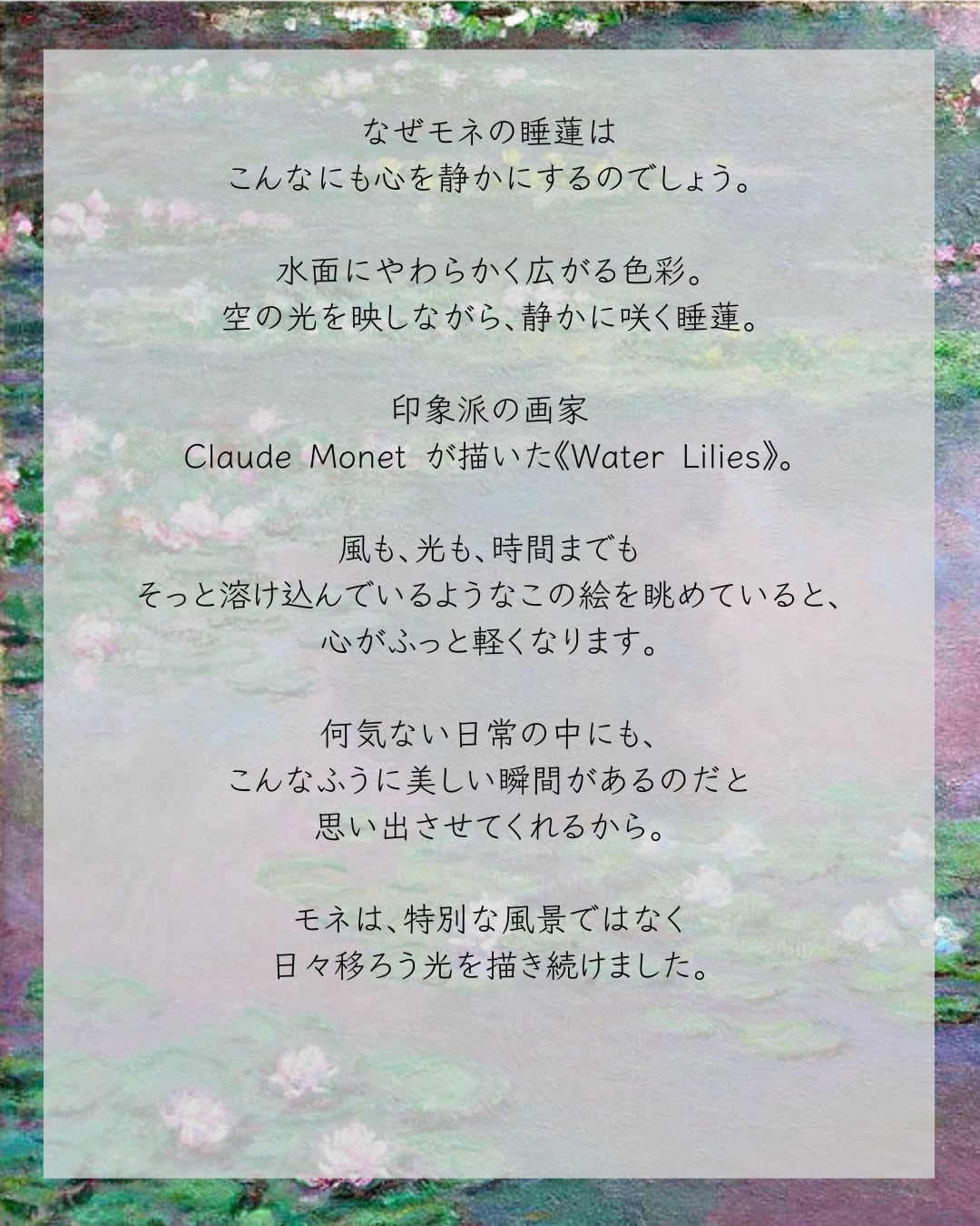 モネの晩年の大連作『睡蓮』をデザインしました。
