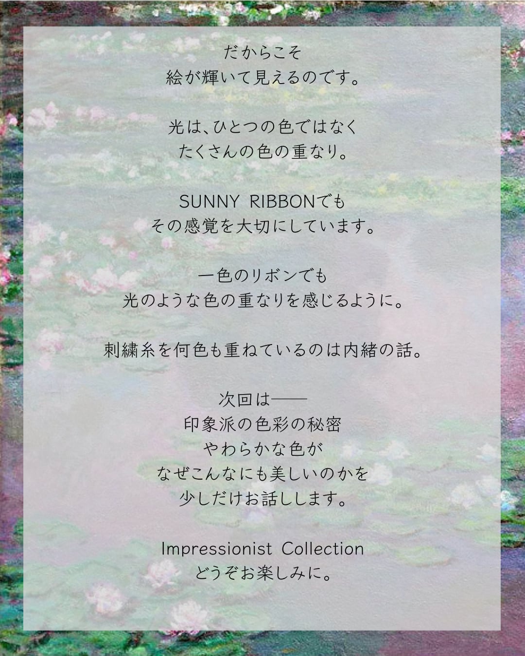 モネ没後100年を記念して、SUNNY RIBBON春の新作印象派コレクション。