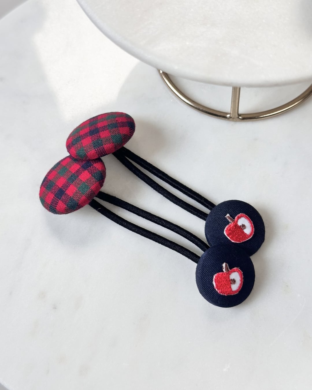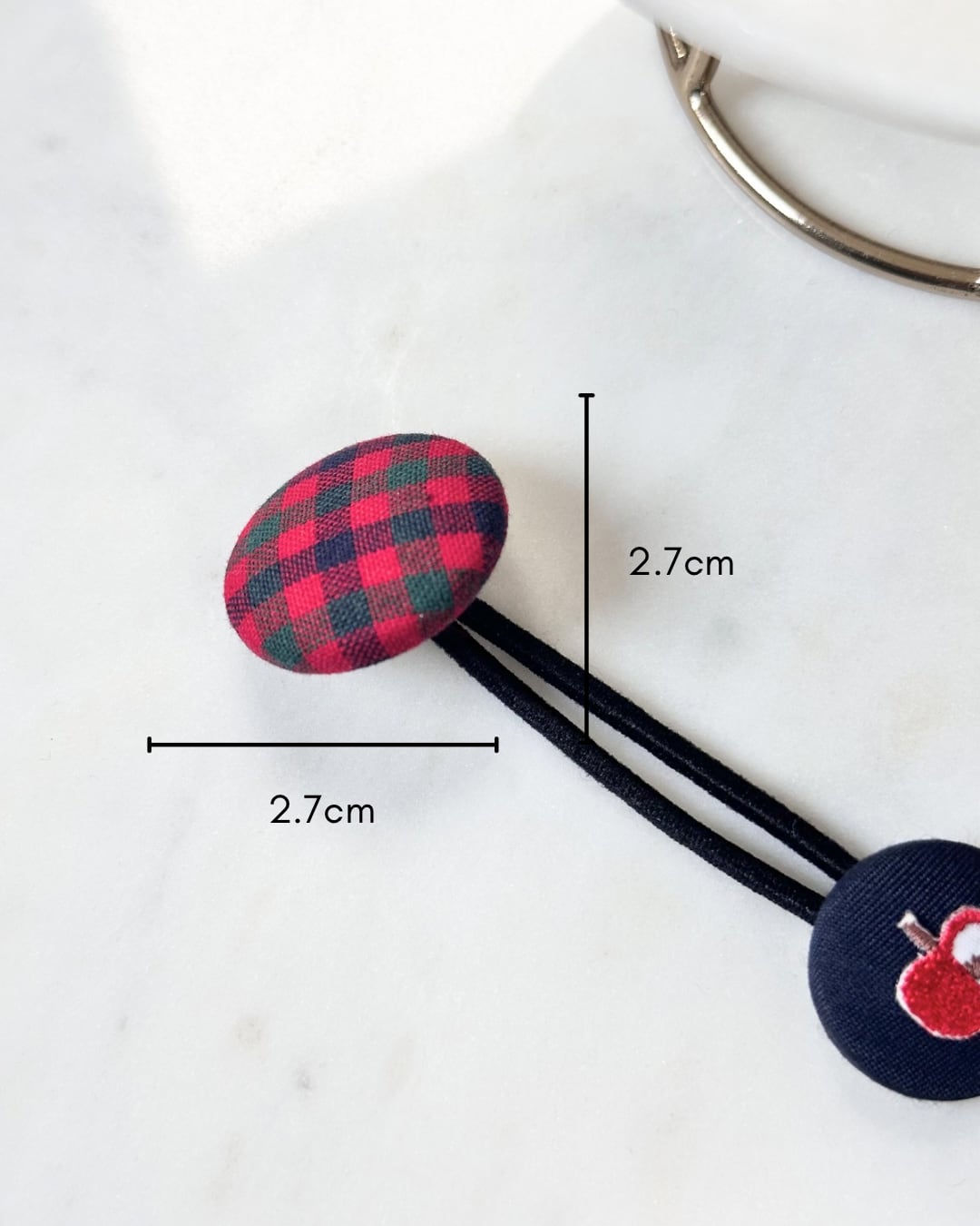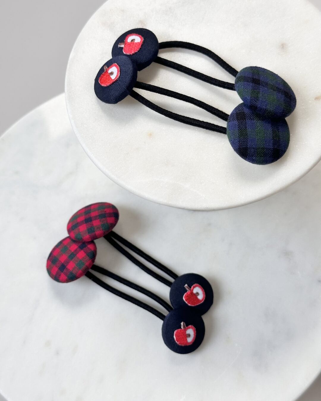 品のいい赤と緑のチェックとぴったりなりんごのステッチを合わせたくるみボタンのヘアゴム。控えめなのが上品なポイントです。