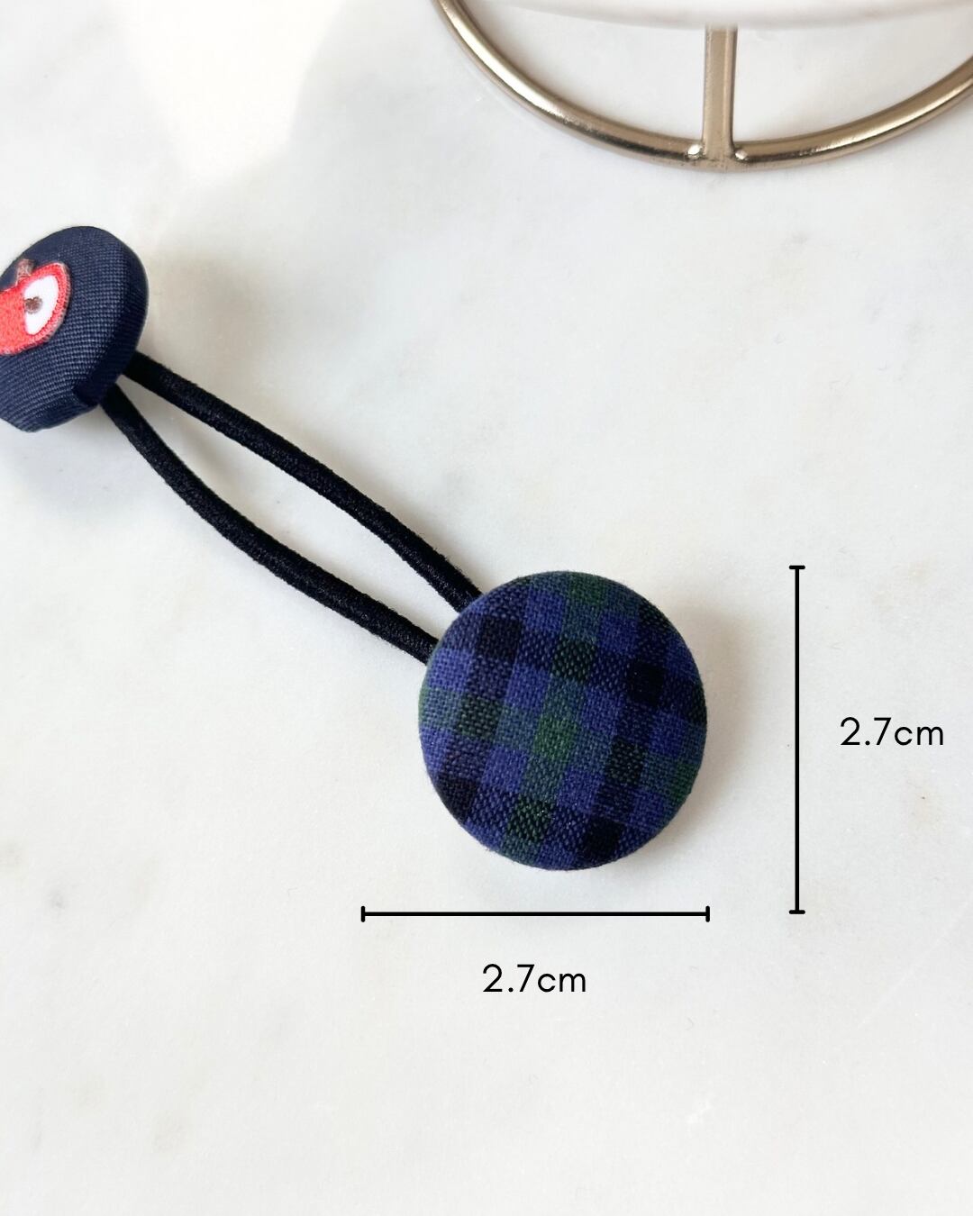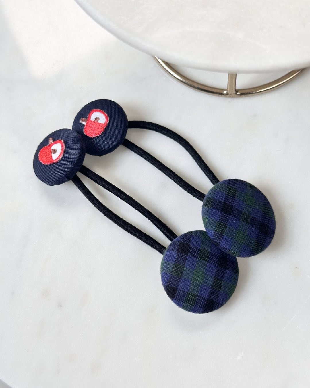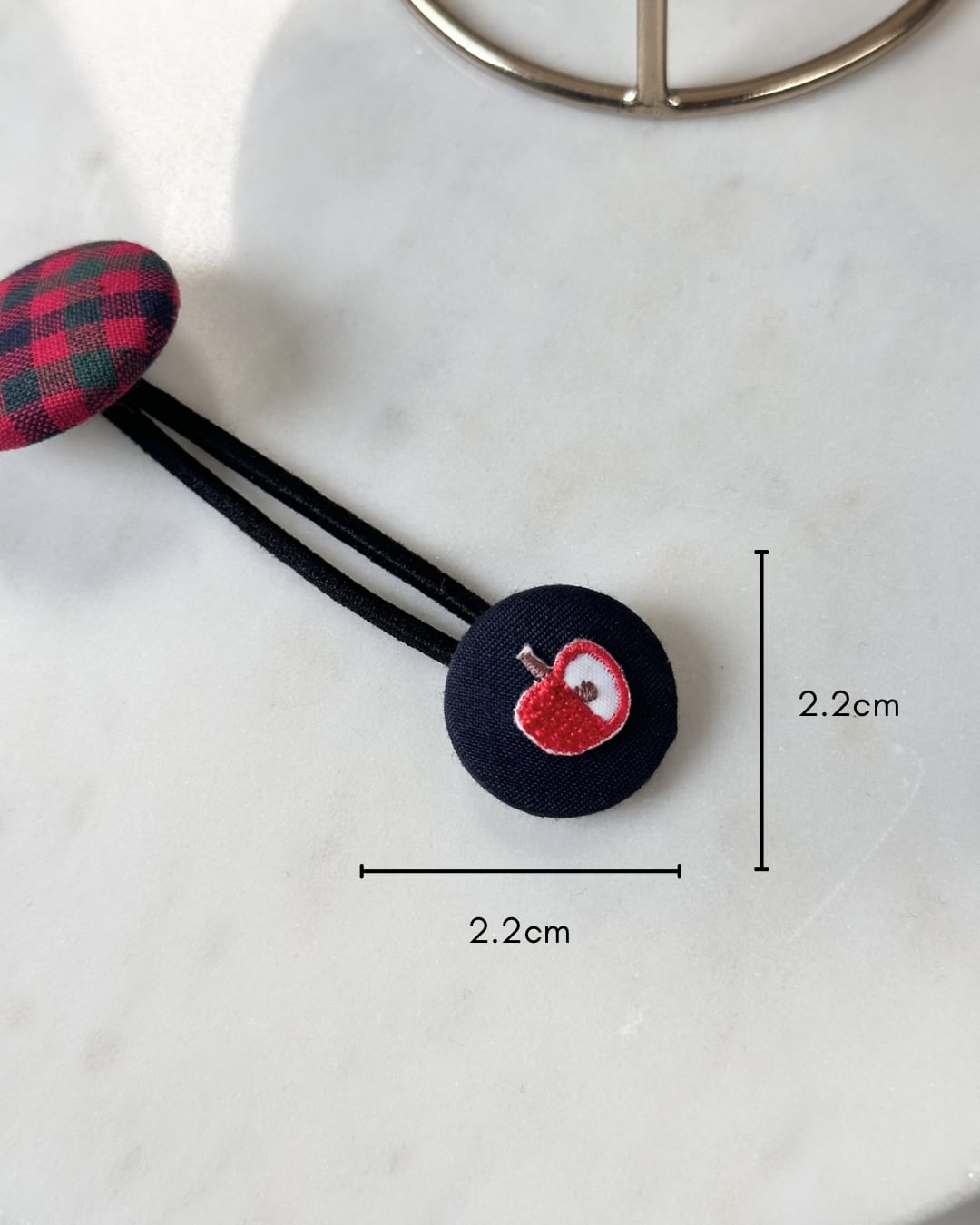 品のいい赤と緑のチェックとぴったりなりんごのステッチを合わせたくるみボタンのヘアゴム。控えめなのが上品なポイントです。