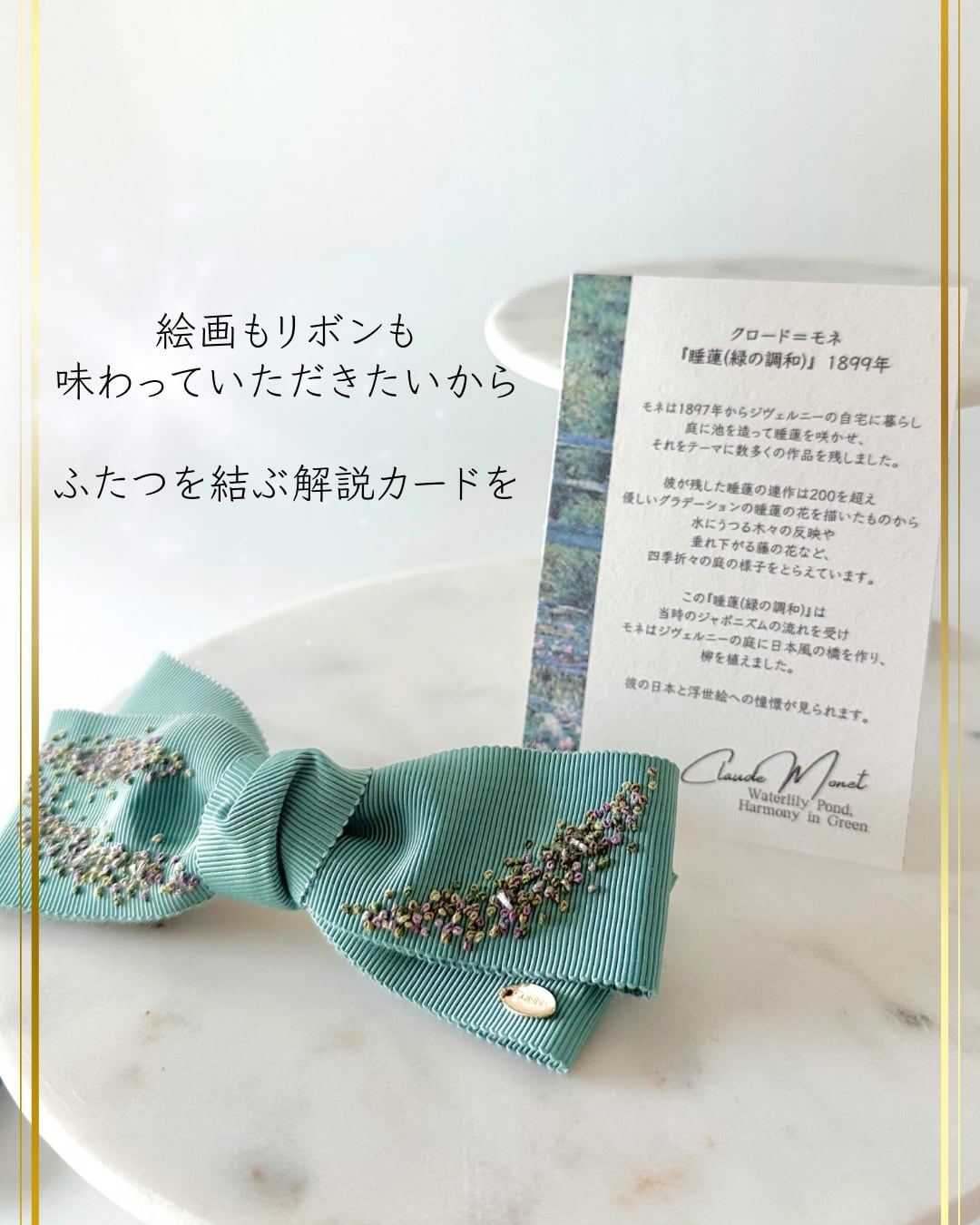 「睡蓮」のデザインでも実現したいのは、花々が浮かび上がるような夢の世界への誘い。鮮やかな色彩を纏うリボンが、あなたの髪を美しく彩ります。自分へのご褒美としてはもちろん、アートに造詣の深い方、大切な人へのギフトとしても喜んでいただけます。