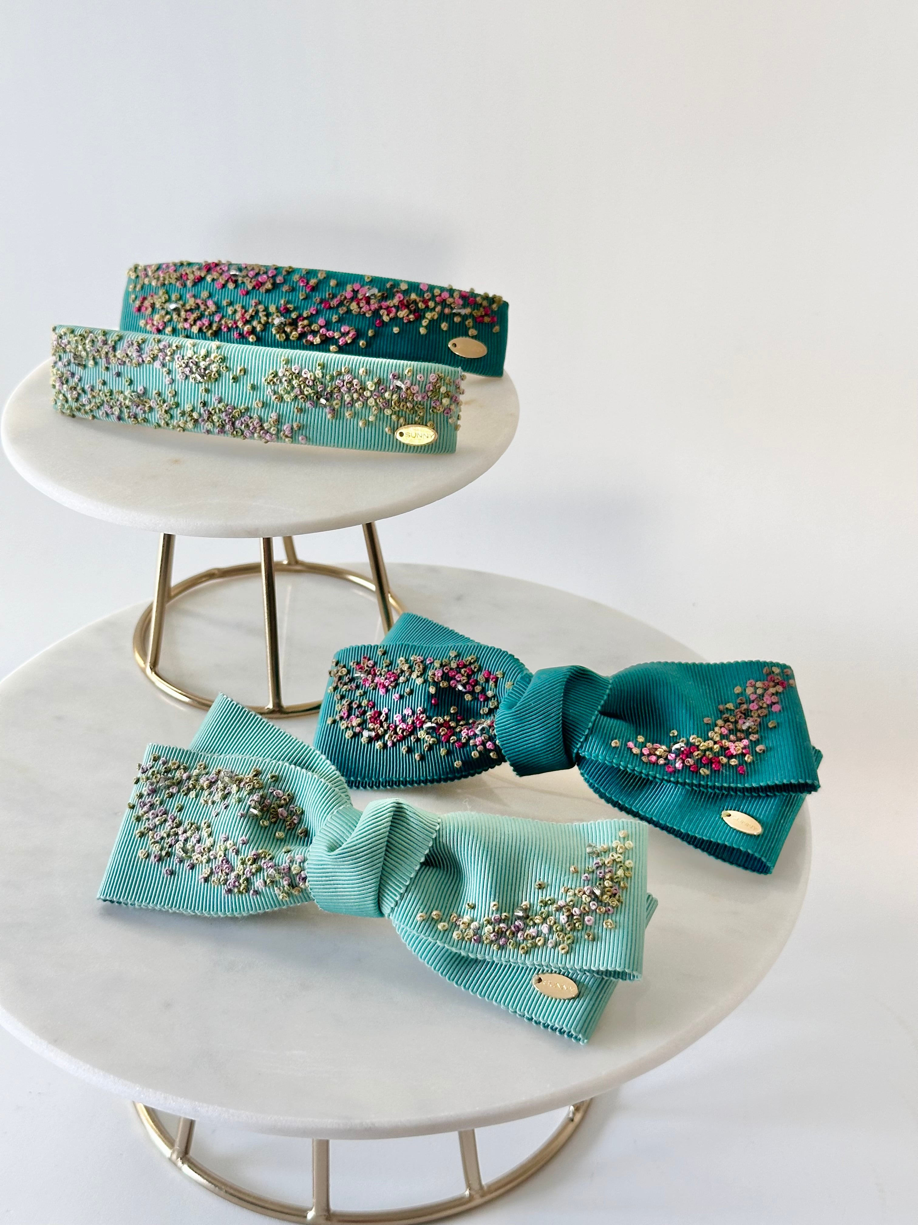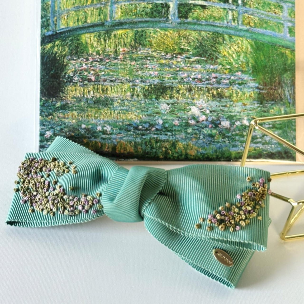 美しい水面に広がるモネの睡蓮をイメージしたデザインのリボンヘアアクセサリー、「Les Nymphéas “睡蓮”」。1針ずつ丁寧に刺繍し、水面のキラキラとした輝きを表現するのに、SUNNY RIBBONで初めてスワロフスキーのビーズを使用しています。